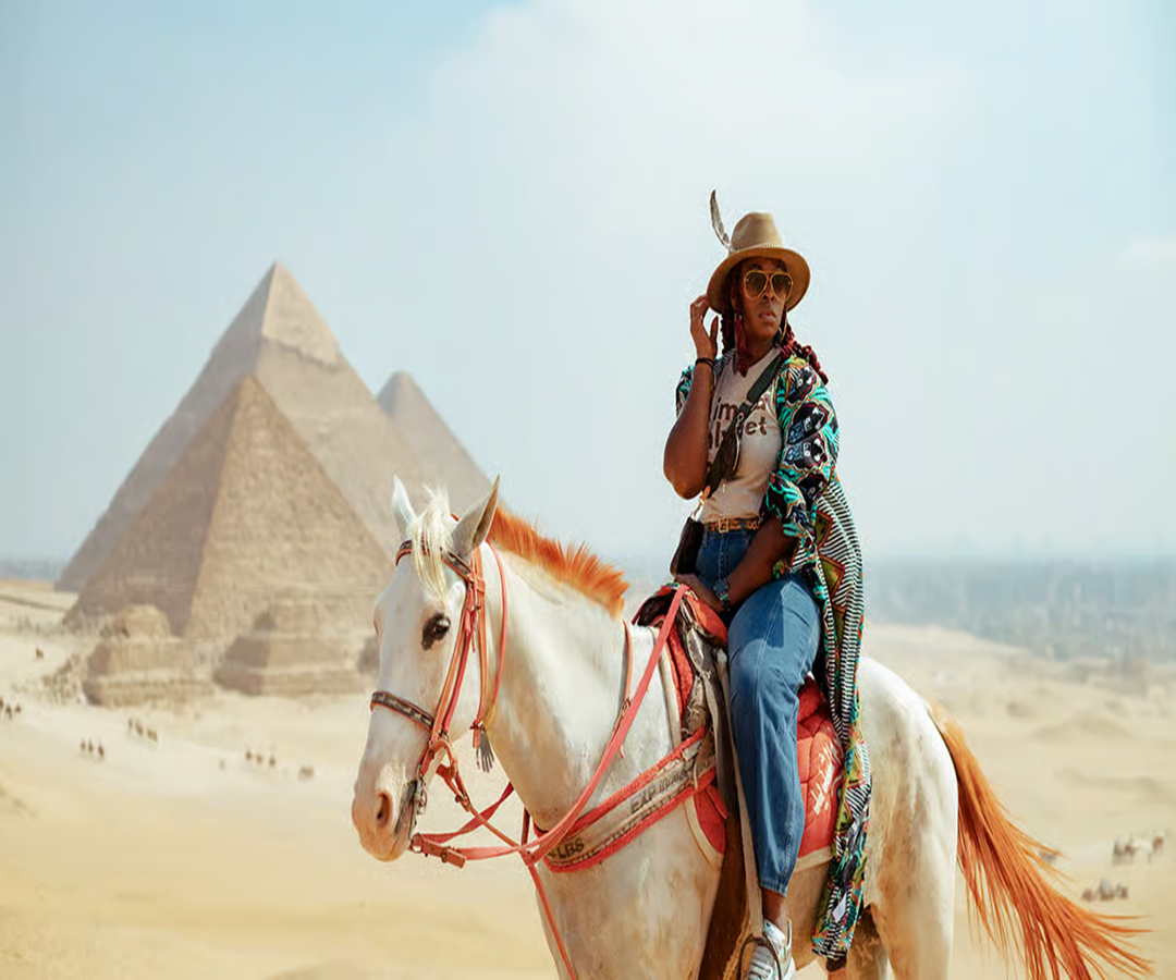Embark on a captivating journey through the desert and discover the timeless wonders of the Giza Pyramids. Ride a horse or camel across the golden desert dunes, taking in the breathtaking view of the majestic pyramids of Khufu, Khafre, and Menkaure rising on the horizon. Travel back in time as you explore these ancient marvels, testaments to human ingenuity and architectural mastery. Whether at sunrise or under the warm hues of an unforgettable sunset, this experience promises a truly unique perspective. Immerse yourself in the splendor of Egypt's most iconic monument and create memories you will cherish forever.