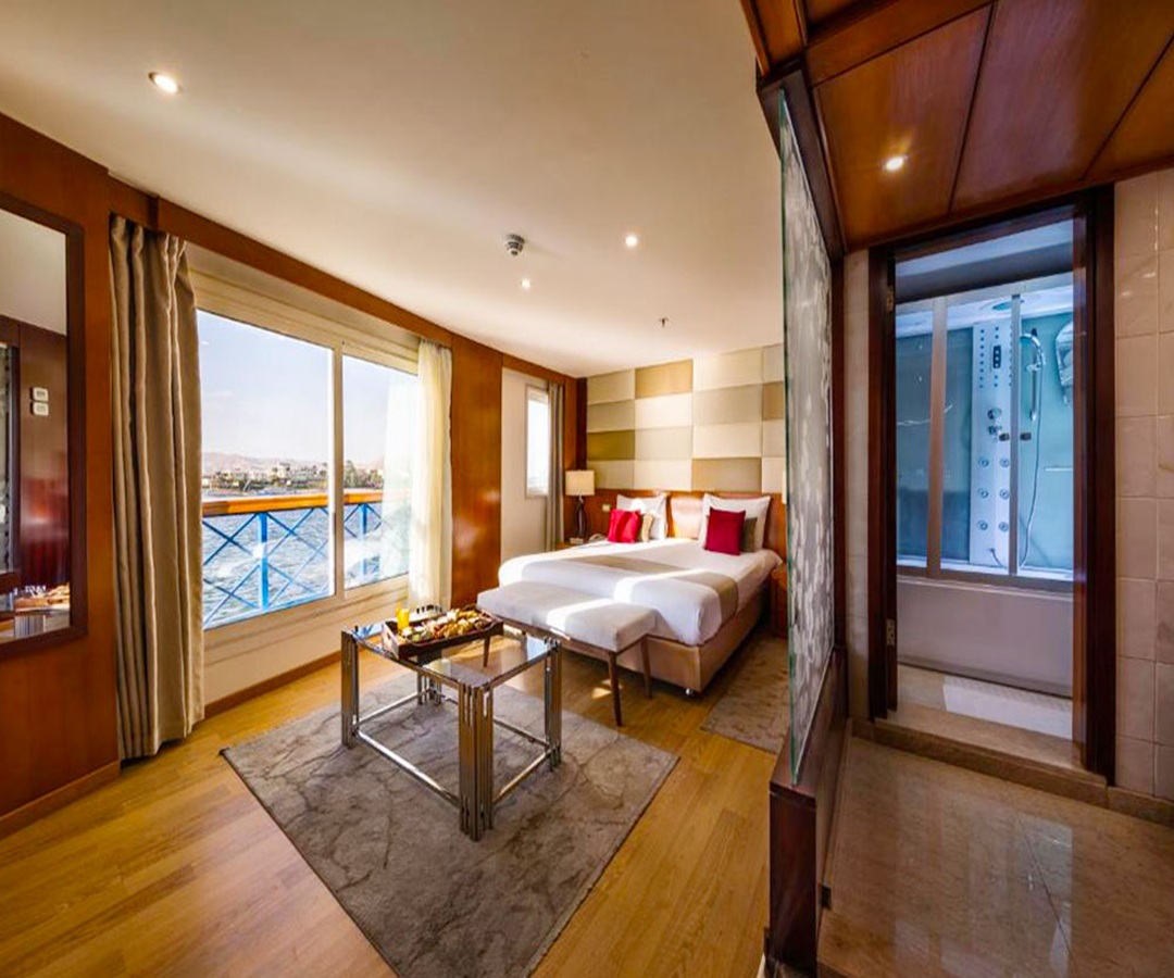 Esmeralda Nile Cruise is a modern and luxurious cruise ship offering a premium sailing experience on the Nile River between Luxor and Aswan. Designed with contemporary elegance, this floating hotel combines comfort, style, and exceptional service to provide guests with an unforgettable journey through the heart of Ancient Egypt. Each cabin and suite aboard the Esmeralda is tastefully decorated and equipped with large panoramic windows, allowing guests to enjoy the breathtaking scenery of the Nile in complete comfort. The cruise features a spacious sundeck with a swimming pool, an upscale restaurant offering a blend of international and Egyptian cuisine, and a welcoming lounge bar perfect for relaxing in the evening.