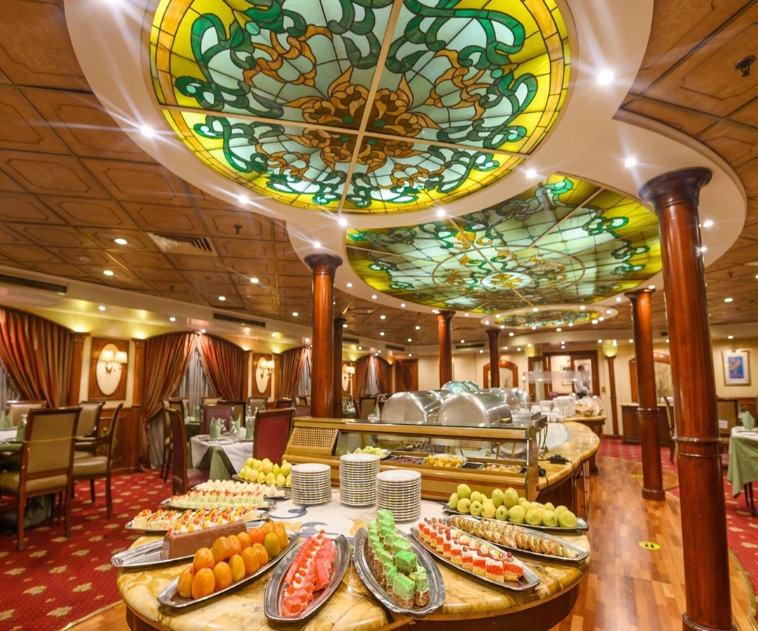 The Royal Princess Nile Cruise is a luxurious 5-star ship that offers an exceptional way to explore Egypt's historical treasures while sailing along the breathtaking Nile River. Combining comfort, elegance, and modern amenities, this cruise provides an unforgettable journey from Luxor to Aswan and back. Aboard the Royal Princess Nile Cruise, guests enjoy spacious and well-appointed cabins with panoramic views of the Nile. The ship features a large sundeck with a swimming pool, a gourmet restaurant serving a variety of international and Egyptian cuisine, and an elegant lounge bar for relaxation. The cruise is designed to offer maximum comfort and leisure, making it an ideal choice for travelers seeking both relaxation and adventure.