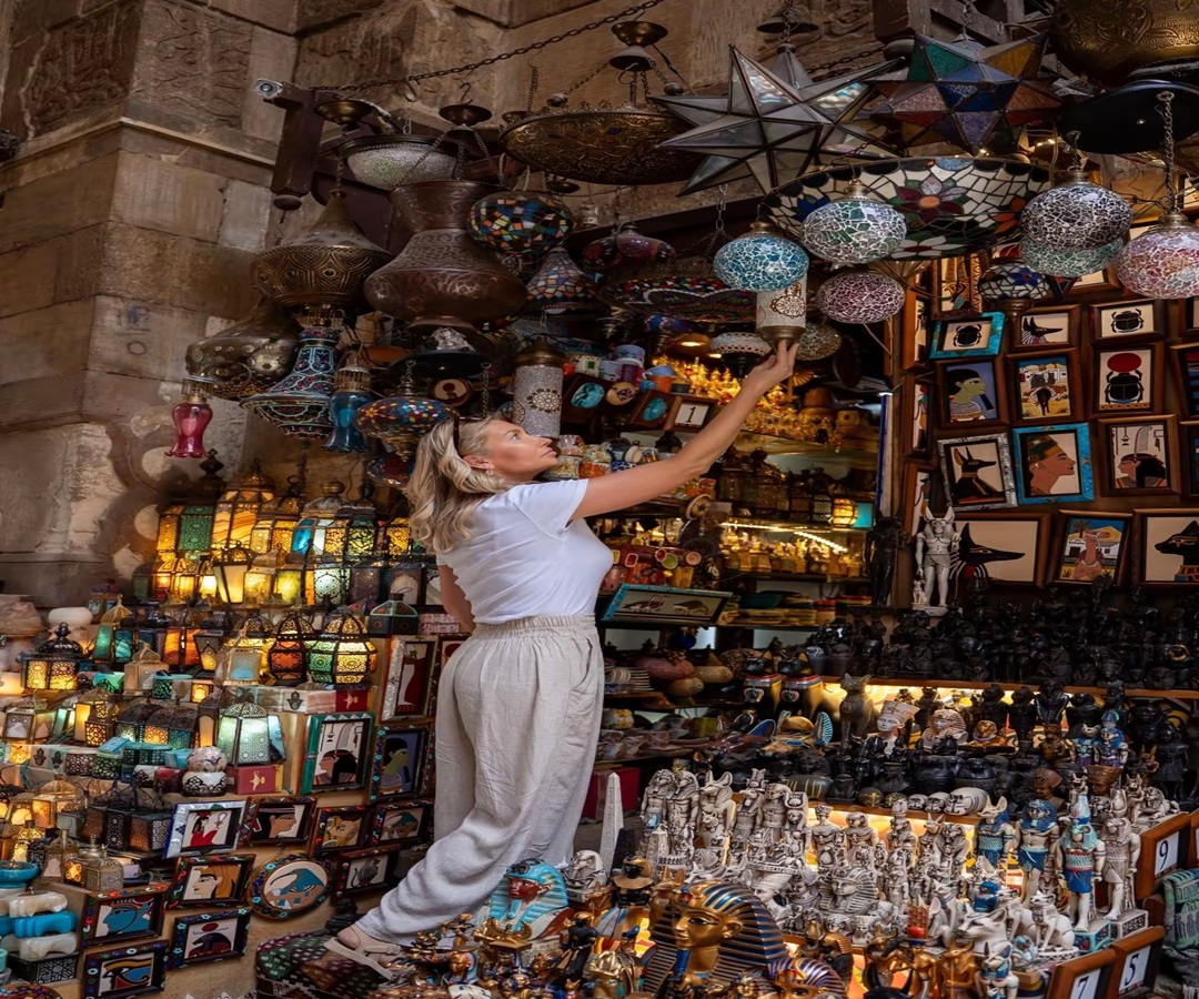 End your day with a stroll through Khan El Khalili, Cairo’s famous bazaar. Immerse yourself in the vibrant atmosphere as you wander through narrow alleyways filled with colorful stalls selling handcrafted jewelry, traditional textiles, spices, and souvenirs. It’s the perfect place to soak up the charm of old Cairo and pick up some unique mementos.